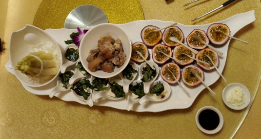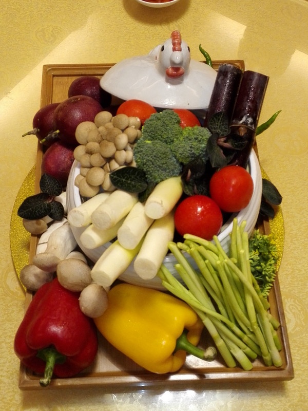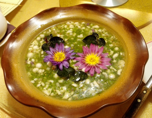 喝的汤,是以一大陶盘装着蒓菜羮,上面飘有莲花木耳,色香味俱全。这是新派菜,但没有忘记传统做法。冬瓜节瓜菜,也是以原形的瓜挖空当碗碟。