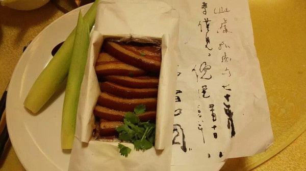 “手工宣纸蔗香扣肉”更是养眼,用食材制成的宣纸,书写着飞舞隽永的书法作品,让你不敢相信,谁这么大胆,把书法和肥肉结合在一起了。「宣纸蒸香扣肉」,用黑毛猪的上等五花腩及鲜嫩甘蔗心为主要的食材,加上在埔里酿制的陈年绍兴酒和当地盛产的茭白笋,把肉焖熟后用宣纸包扎,以一大个盘上桌,卖相先声夺人,味道极佳。带了倪匡兄去吃过后,他挥笔题上「此扣肉为七十年来仅见」几个字,当今已把他老兄的墨宝印在包肉的宣纸上志之。