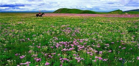 京北第一草原,草原上山高谷阔,水洼星罗,绿油油的草原犹如一块毛茸茸的绿毯,平铺在地面上。草原风光因晨昏交替而变幻无穷,清晨,一匹匹马儿在雾中吃草饮露,颇有“风吹云散见骏马”的景致;中午,金色的阳光直射在茫茫草海上,把绿色草原映得更加油亮耀眼;黄昏,骏马载着少年冲向原野,去追回散漫的畜群;入夜,如水的月光给草原罩上一层轻纱,使星星点点的各色野花朦胧有致。