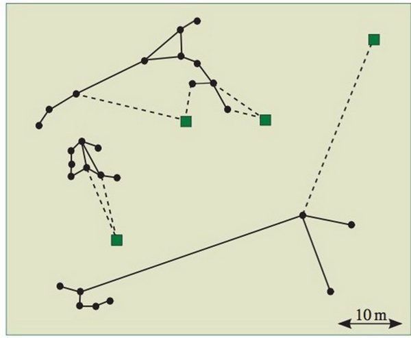 肉蚁运输系统的范例:圆点代表巢穴,绿块代表树木,虚线表示直接连接巢穴和树木的蚁径