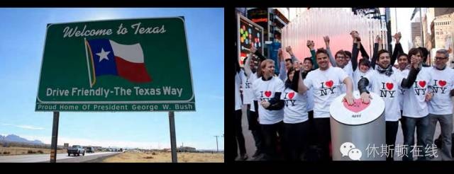 2014年初,一位在休斯顿生活过的纽约建筑师唐朔,收集与拍摄了60余组照片,定格下纽约与休斯顿之间的城市故事。这组名为《双城记》作品中记录了两座城市相似却又不同的细节:休斯顿“Subway”的标志一定指的是快餐店,而在纽约人们却要犹豫“Subway”究竟是餐厅还是地铁;本以为“Park”一定是停车场的意思,在纽约它也是一家餐厅;城际高速入口的限速,休斯顿比纽约快了20英里;纽约人在时代广场高呼着“I Love New York”,而德州人民会微笑地说,“Welcome to Texas”,并给你一个坚实的拥抱……
